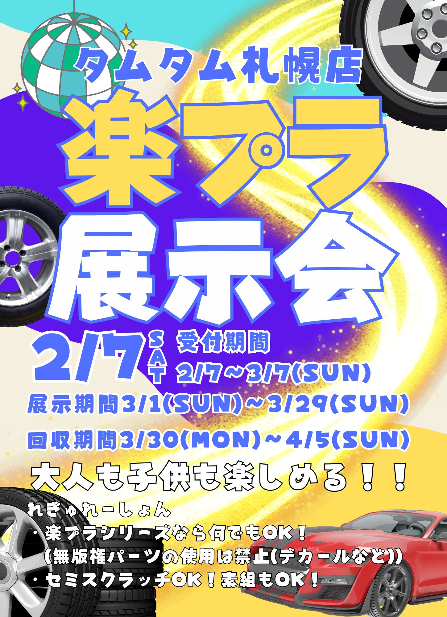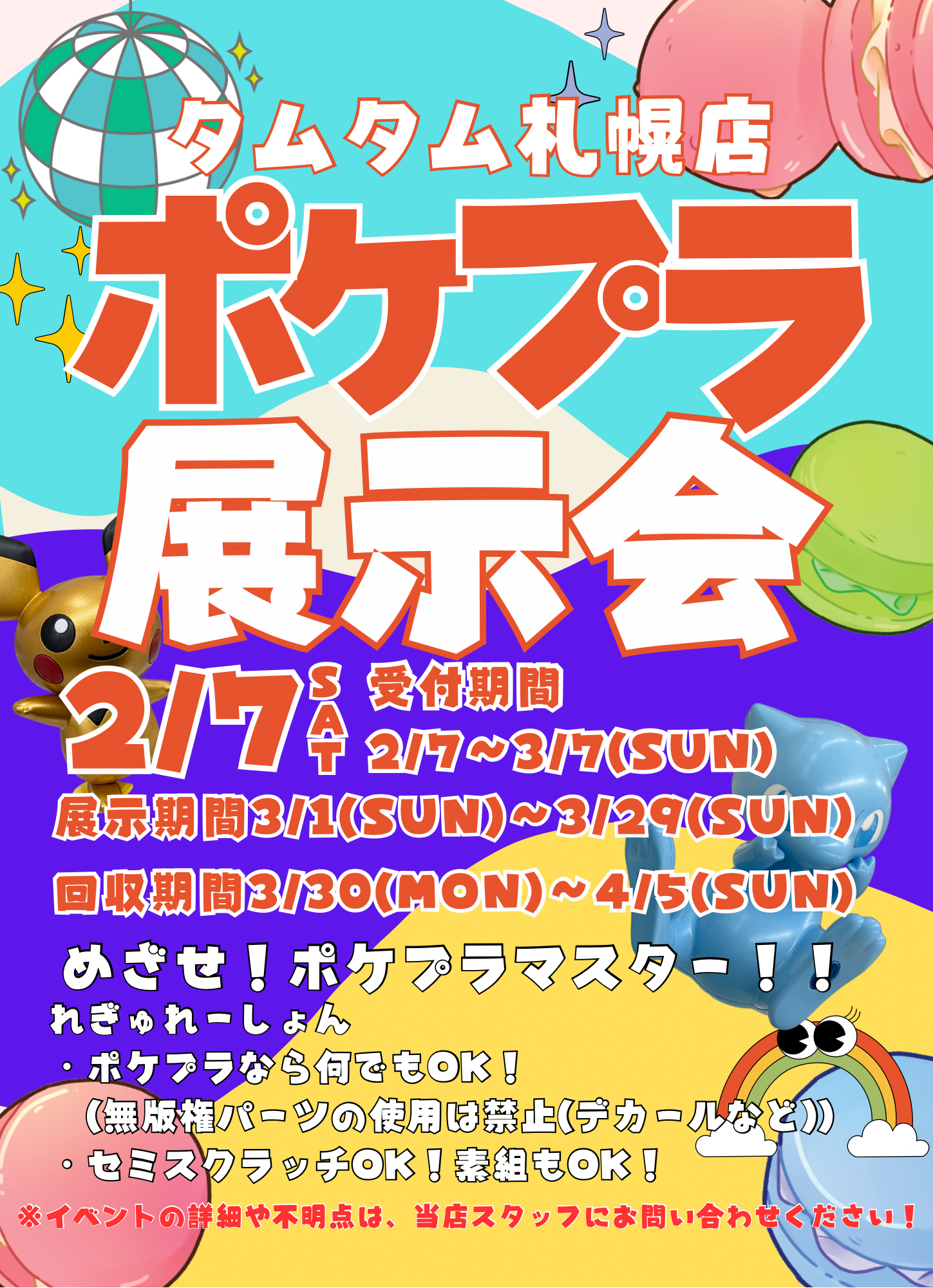 【札幌店】プラモデル展示イベント2種開催!! カテゴリ:プラモデル 開催日 / 2026/02/07(土)~2026/04/05(日) 開催店舗 / 札幌店 今年の2月~は!!・ポケモンプラモデル・アオシマ楽プラ展示会2種同時開催です!!開催期間 2/7~3/29受付期間 2/7~3/7回収期間 3/30~4/5 皆様のご参加お待ちしております!