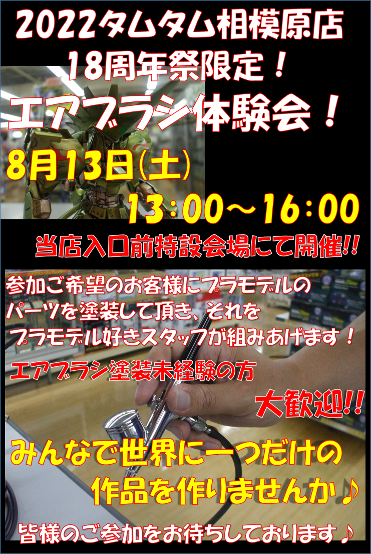 18周年祭限定 プラモデル展示会・エアブラシ体験会! カテゴリ:プラモデル 開催日 / 2022/08/13(土)~2022/08/14(日) 開催店舗 / 相模原店 8月13日(土)・14日(日)開催の「タムタム相模原店18周年祭」!各部門で楽しいイベントを多数ご用意して皆様のご来店をお待ちしております♪プラモデル部では、8月13日(土)・14日(日)の2日間限定でプラモデル展示会を開催いたします!8月13日(土)にはエアブラシ体験会も開催!お楽しみに♪詳細はこちらをご覧ください♪