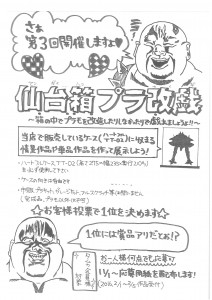 仙台箱プラ改戯 カテゴリ:プラモデル 開催日 / 2016/02/01(月)~2016/02/15(月) 開催店舗 / 仙台店 第三回 仙台箱プラ改戯を開催致します。 作品受付は2月15日までハートフルのケース(TT-02)内で行われるお客様投票でのバトルを見逃すな!!1位には商品が・・・あるか・・・